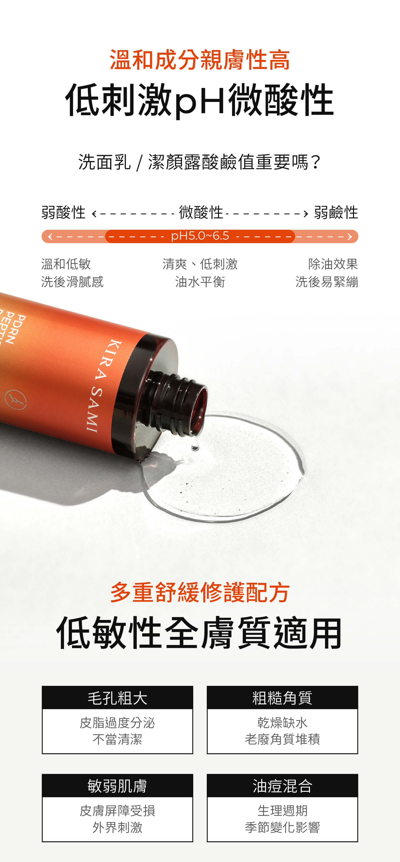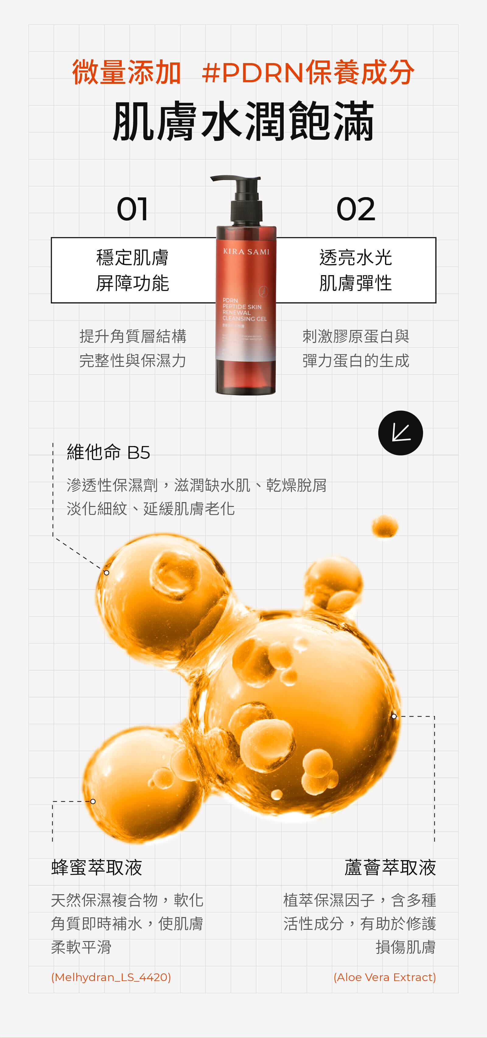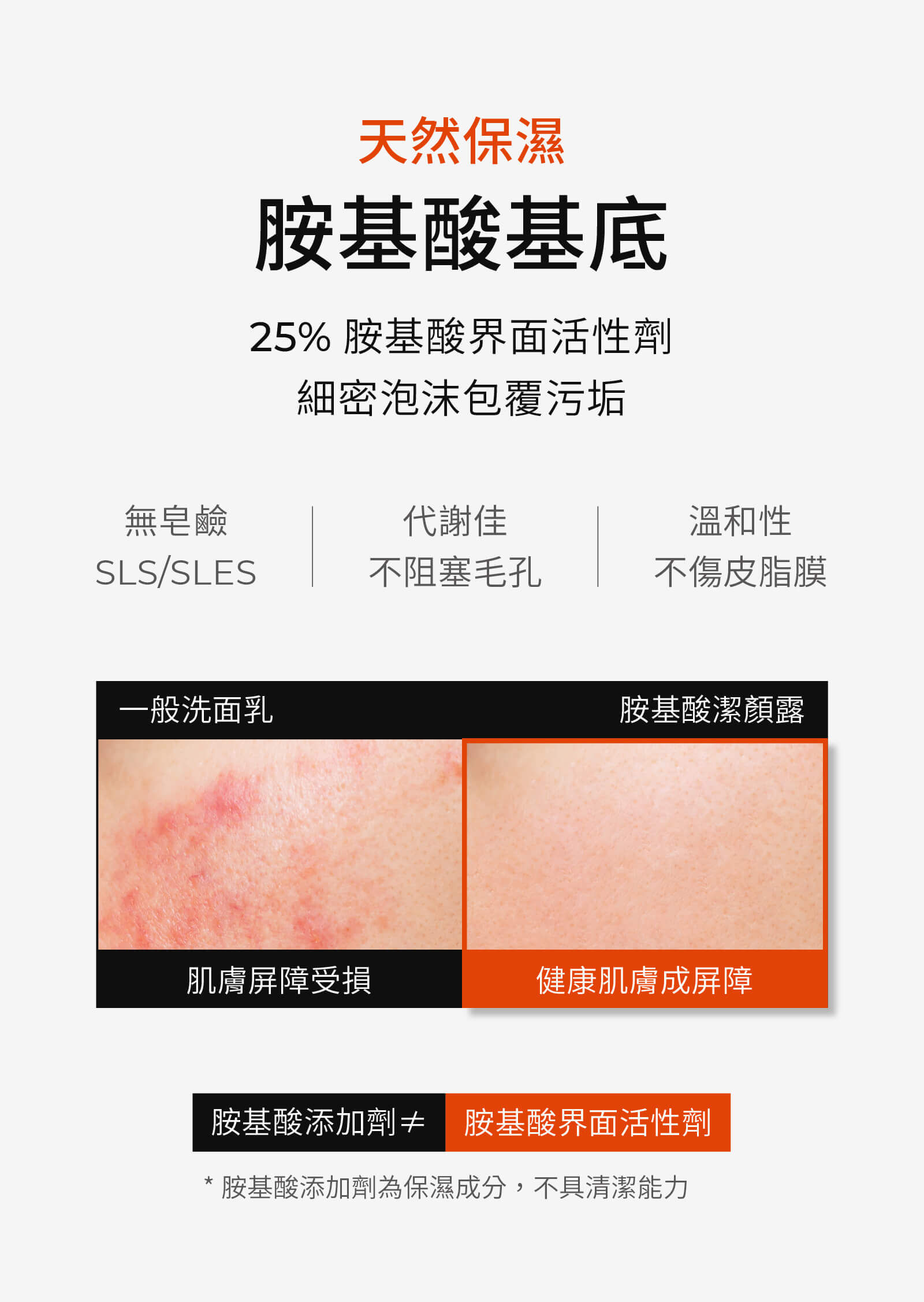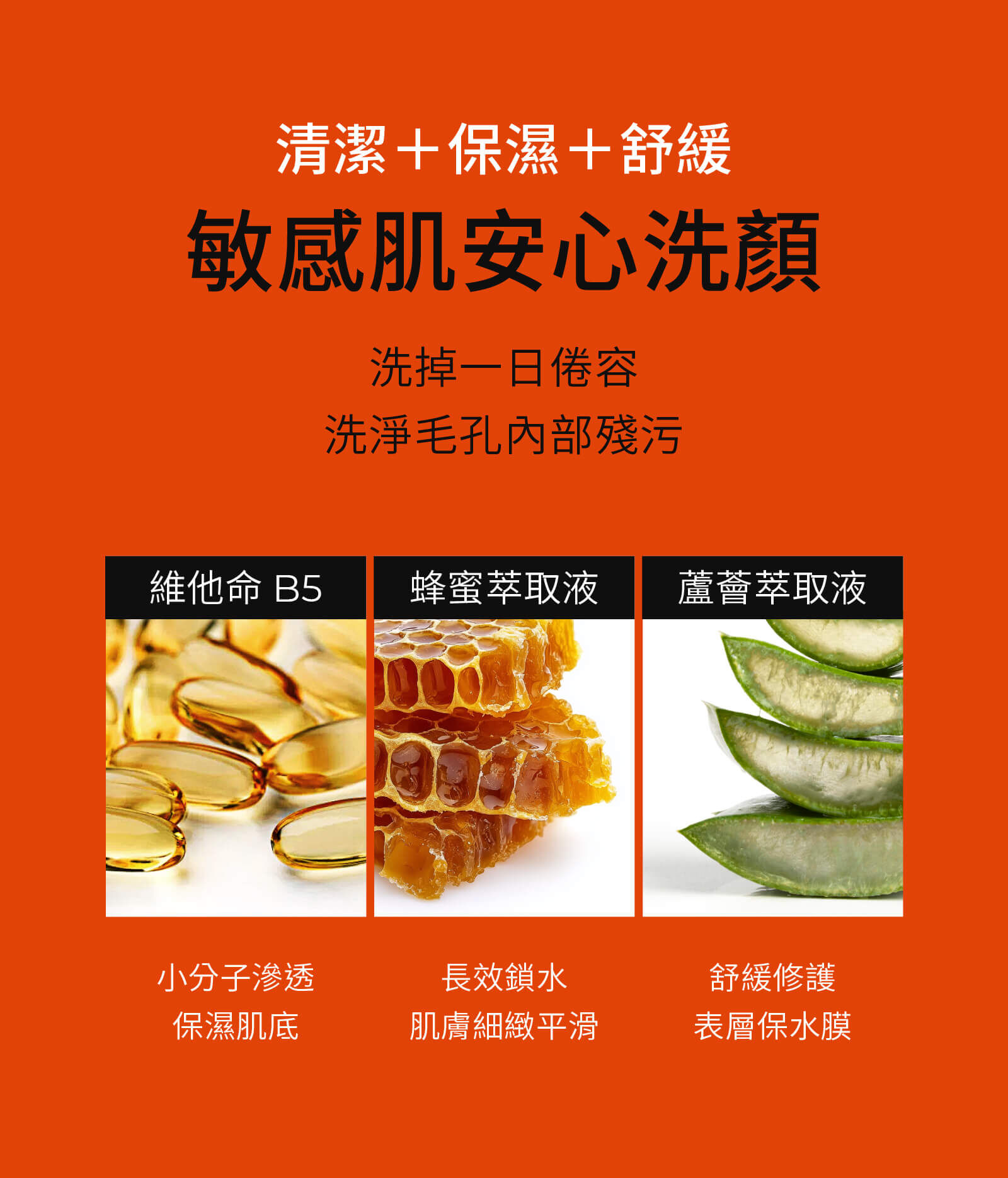 蘊含 25% 胺基酸界面活性劑,搭配PDRN、維生素B5、蘆薈和蜂蜜萃取,有效去除髒污,同時舒緩修護肌膚,洗後水潤不緊繃。